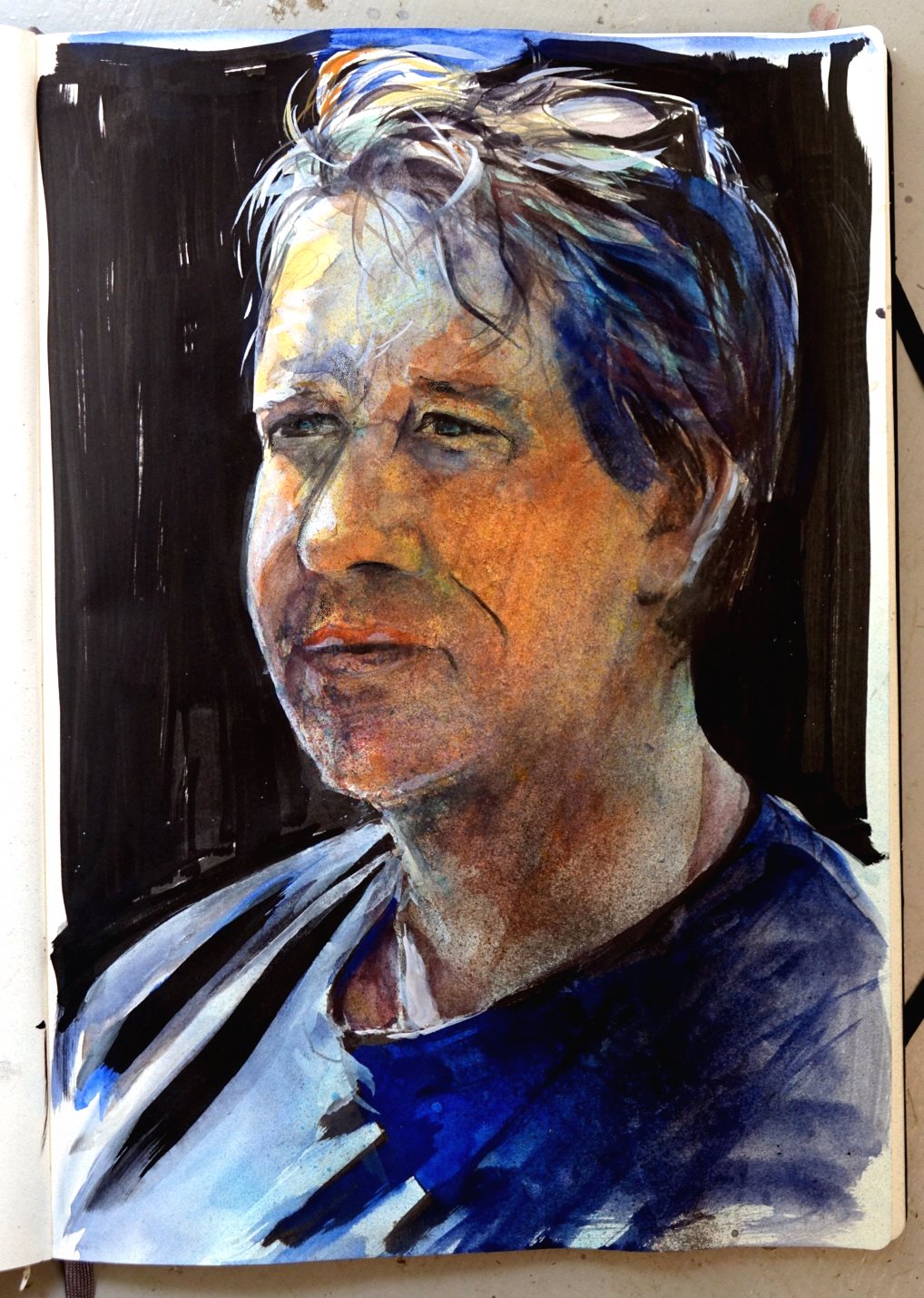 It was a perfect autumn day so we sat out on his back porch and caught up with each other's lives while I sketched. I brought my large Moleskine sketchbook (12"x16") which I knew would be ambitious for just an hour sketch. Well, the time flew by for me, as it so often does when I'm sketching/painting and before I knew it, my time was up. I didn't especially like the portrait I painted so I took a photo of Stephen with my phone with the plan that I would fix it back in the studio.